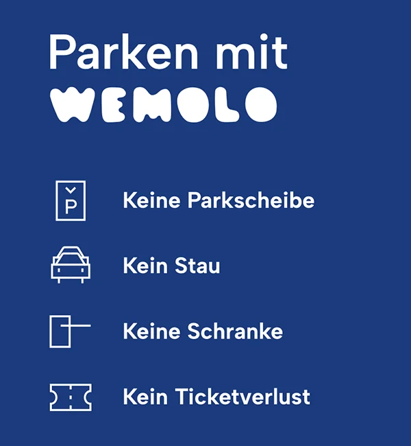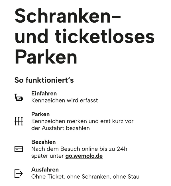 Mit Wemolo verläuft der Parkvorgang digital und transparent. Ticket ziehen, Vorgang abschließen, fertig. Hinweise an der Zufahrt erleichtern die Orientierung.